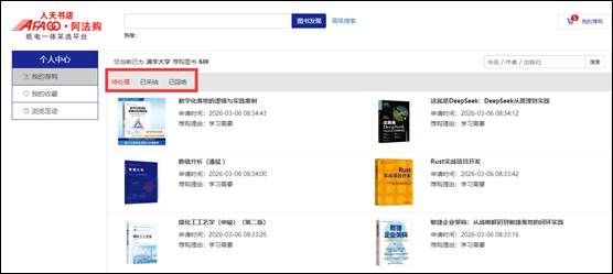 3.我的荐购:【个人中心】→【我的荐购】中可查看到所有的荐购书目,及图书馆的采纳情况。